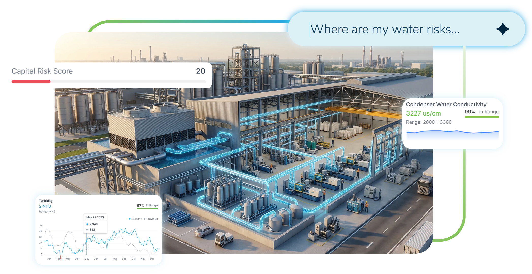 Sensors continuously capture key water quality and operating metrics—such as pH, conductivity, turbidity, ORP, temperature, and chemical residuals—to create a real-time view of process water system conditions.